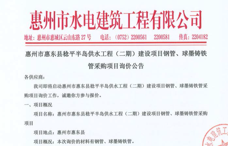 廣東省惠州市中心城區(qū)地下管網(wǎng)系統(tǒng)提升工程—雨水管網(wǎng)建設(shè)項(xiàng)目、惠州市增江龍門段治理工程施工(二標(biāo)段)塑料管及管件采購項(xiàng)目詢價公告……